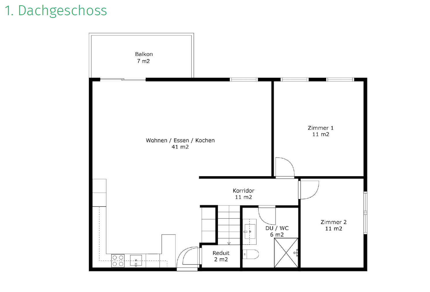 Ohne klassische Trennung gelangen Sie beim Betreten direkt in den offen gestalteten Wohn- und Essbereich mit integrierter Küche – ein heller, einladender Raum, der sofort ein Gefühl von Zuhause vermittelt. Grosse Fensterflächen sorgen für ein freundliches Ambiente und führen auf den sonnigen Balkon mit Blick ins Grüne – ideal zum Entspannen oder für gemeinsame Stunden im Freien. Zwei Schlafzimmer, ein stilvolles Badezimmer mit verglaster Dusche und marmorierten Platten sowie ein praktisches Reduit ergänzen das Angebot auf dieser Etage.