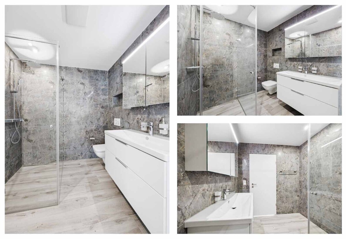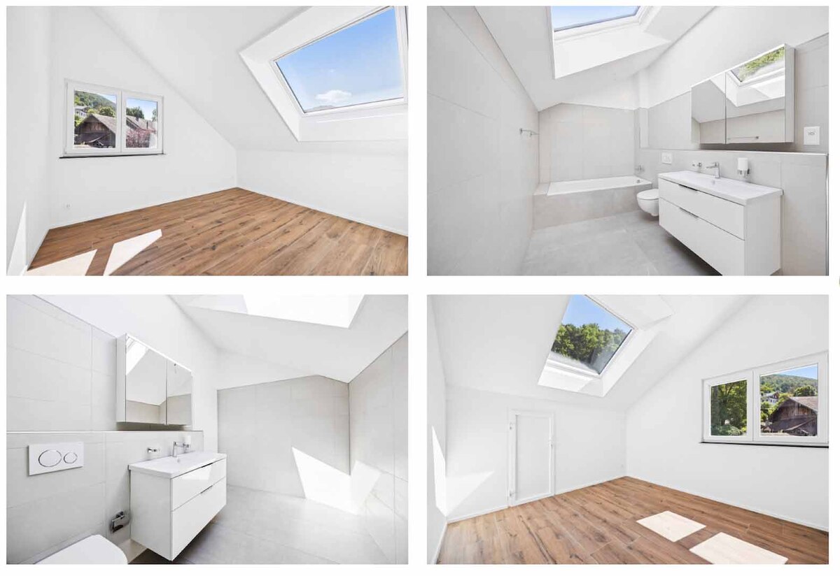 Das Dachgeschoss bietet ein weiteres Highlight: Ein offener Vorplatz führt in einen vielseitig nutzbaren Raum – perfekt als Familienzimmer, Homeoffice oder Rückzugsort. Auch ein zweites Badezimmer mit eleganter Badewanne ist hier vorhanden.