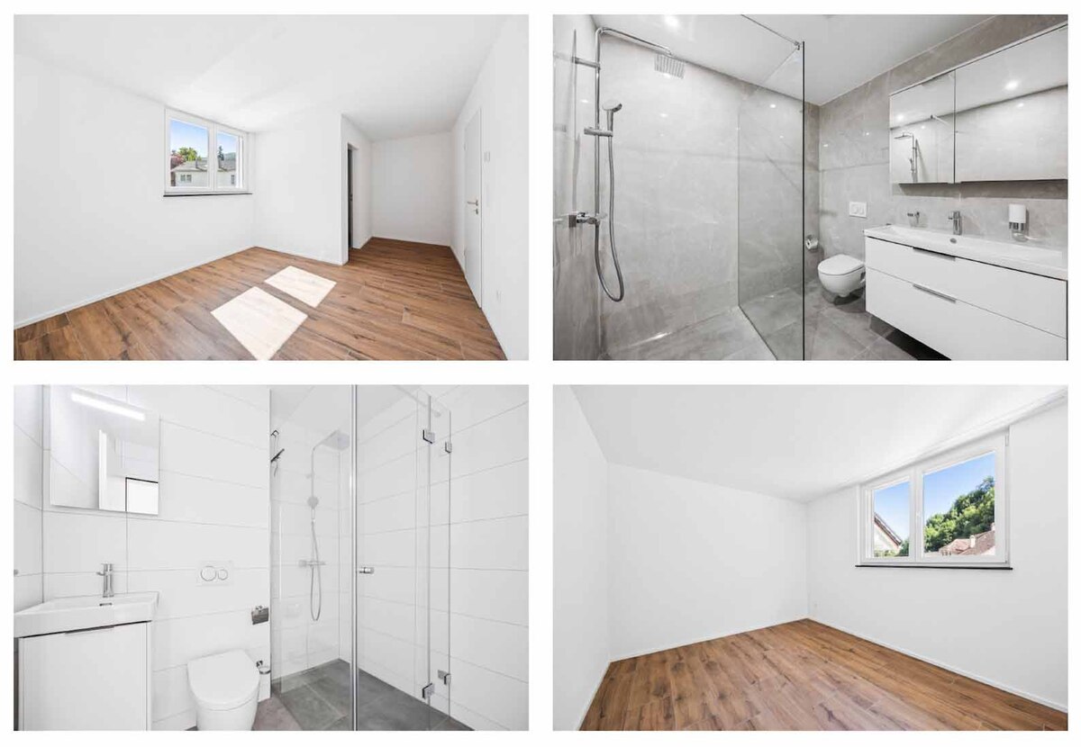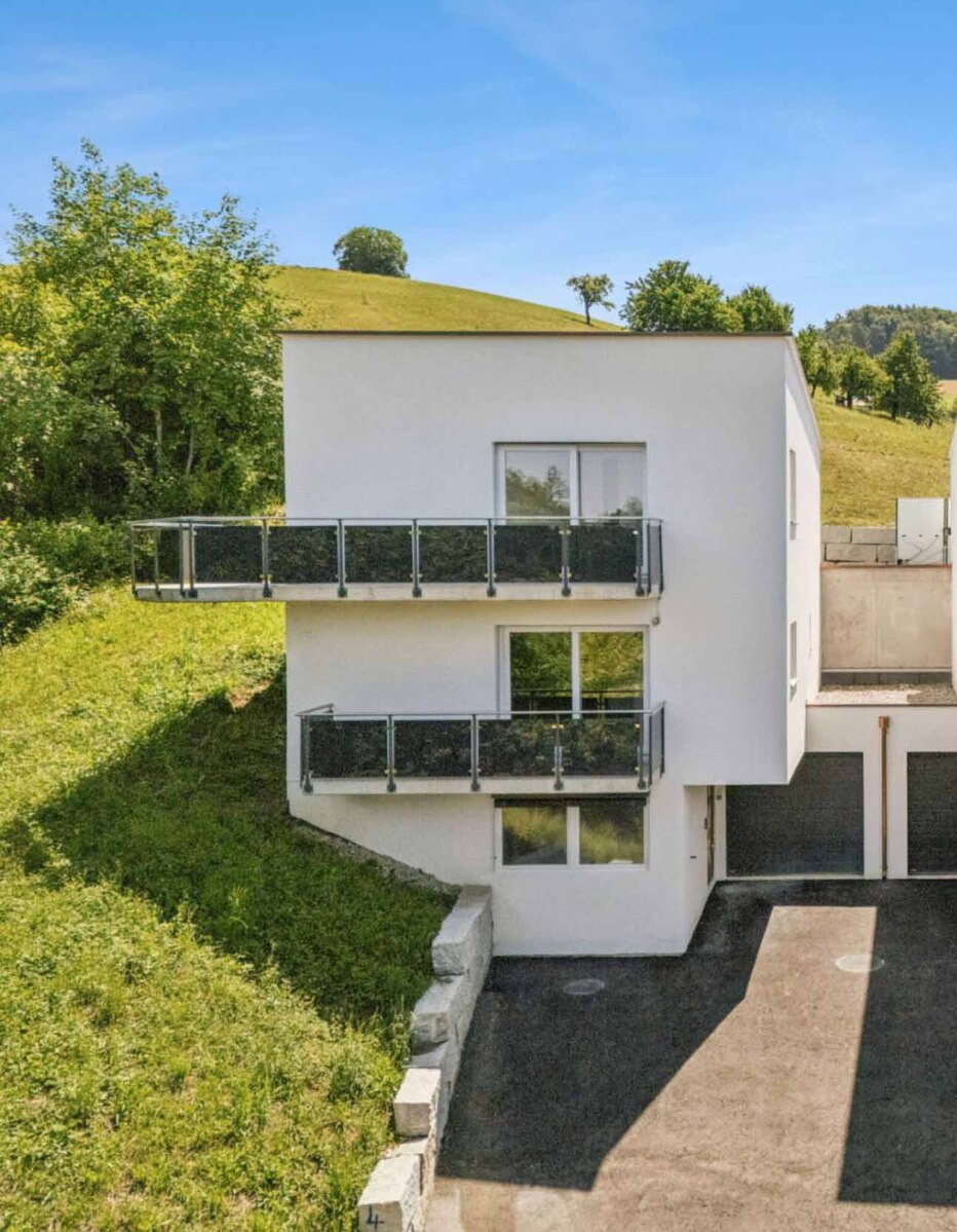Abgerundet wird das attraktive Gesamtpaket durch das Sockelgeschoss mit einem weiteren Zimmer, Réduit, Waschraum (inkl. Waschturm), Keller sowie einer integrierten Doppelgarage. Auf dem Vorplatz können zusätzlich bis zu drei Fahrzeuge abgestellt werden.